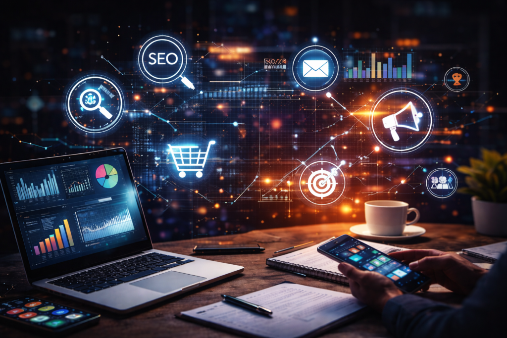 Digital marketing allows businesses to reach targeted audiences effectively. Key strategies include: